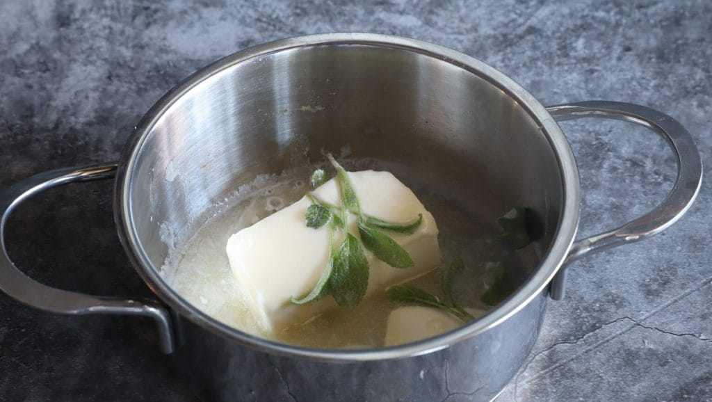 • In een klein pannetje, smelt de boter en bruin de knoflook met verse salie. Alternatief kan ook gedroogde salie worden gebruikt.