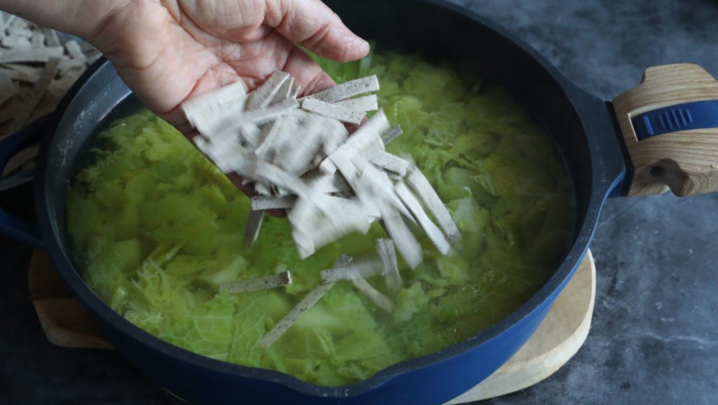• Na de kooktijd, voeg de pizzoccheri toe, laat het weer aan de kook komen en kook nog eens 10 minuten.