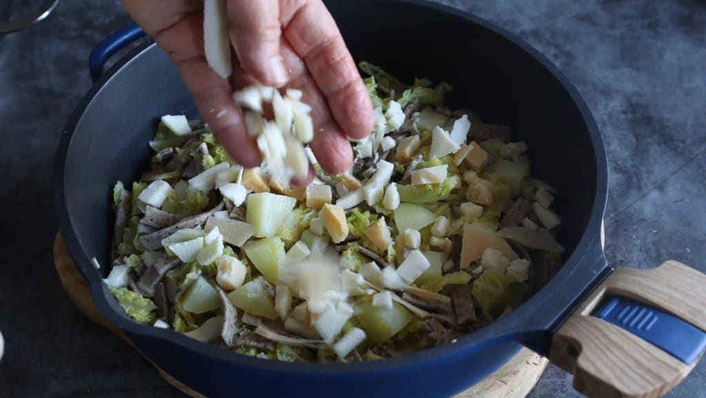 • Zet in de Cookut-pan een laag aardappelen en kool, een handvol kleine stukjes bitto-kaas en de Parmezaanse kaas.