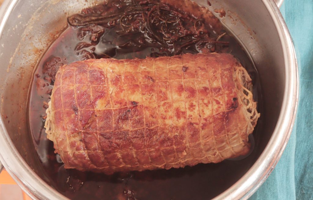 Serveer het varkensgebraad met de wortelsaus.