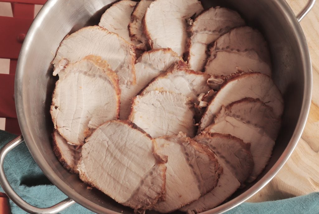 Ik sluit de snelkookpan en laat het ongeveer 40 minuten koken. Ik controleer de garing en zet het uit, laat het afkoelen en haal het net eraf. Ik laat het gebraad uitlekken van de kookvloeistof en leg het op een snijplank, waarna ik het in plakjes snijd.