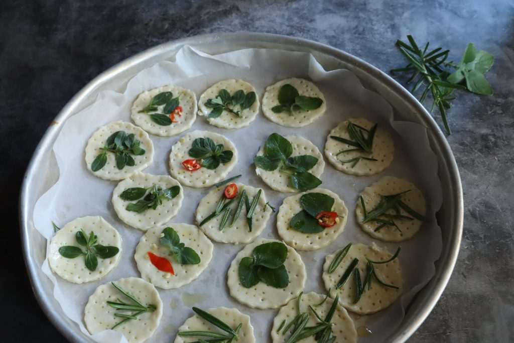Nadat ik alle kruiden heb gewassen en gedroogd, heb ik ze met een lichte druk van de vingers op de bladerdeeg gelegd.