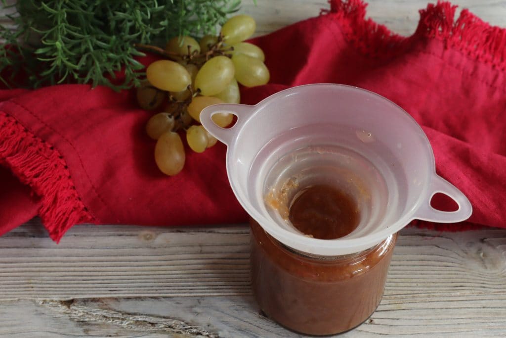 Ik kook de witte druivenjam een uur lang, regelmatig roerend. Na het eerste uur koken, heb ik met de staafmixer de jam gemixt tot hij glad is en zonder schilresten. Ik laat het nog 30 minuten koken en aan het einde,
