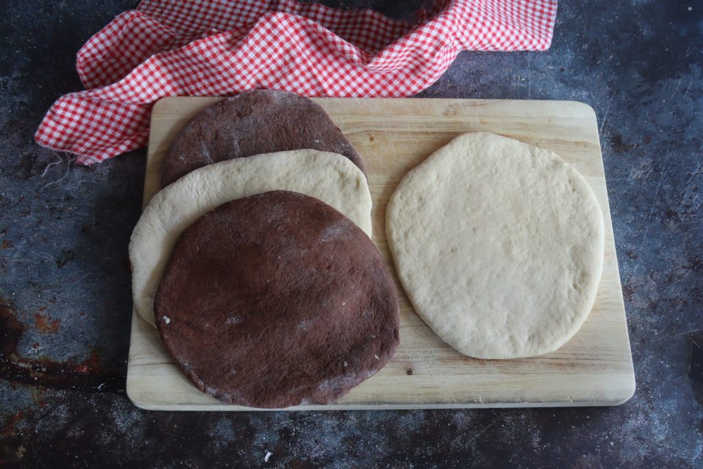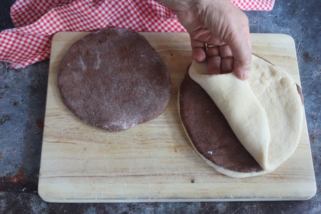 Kneed de twee deegballen afzonderlijk, bedek ze met vershoudfolie en laat ze in volume verdubbelen. Dit duurt minstens 2 uur.