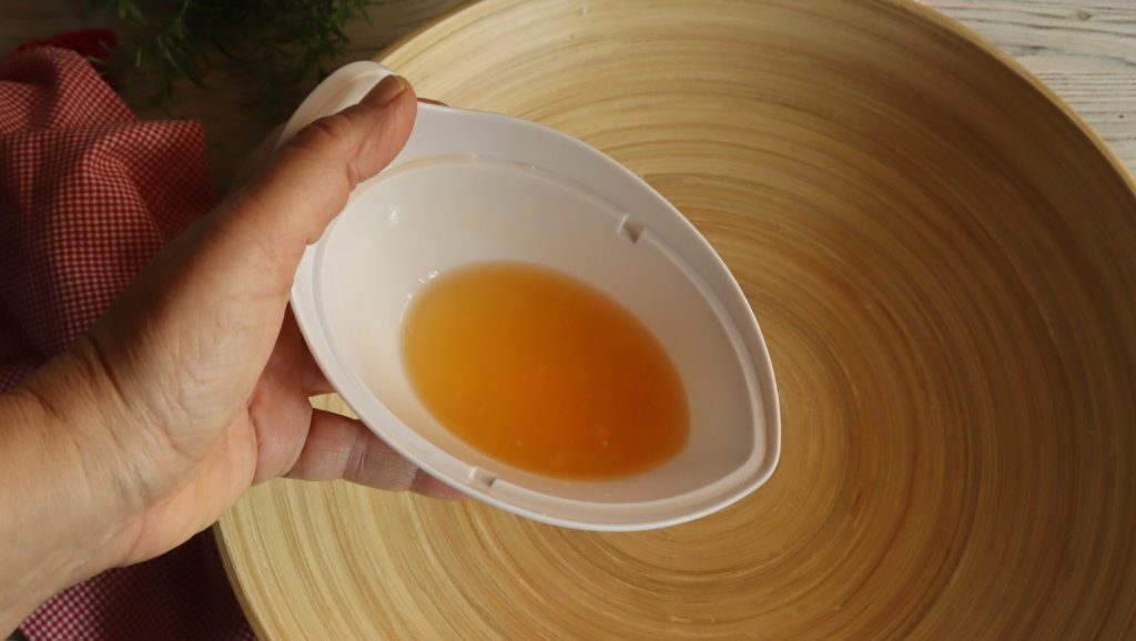• In een grote kom meng je het sinaasappelsap met de honing en olie.