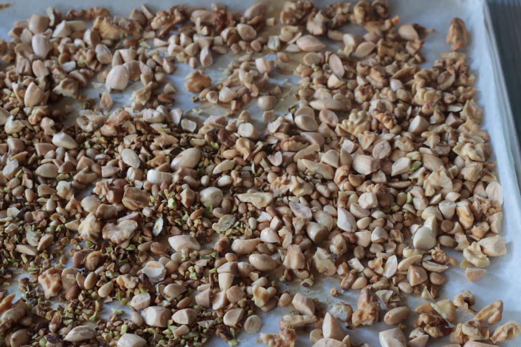 Rooster de amandelen en walnoten samen met de pijnboompitten en het pistachegruis in de oven op 170°C gedurende 10 minuten.