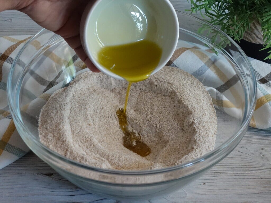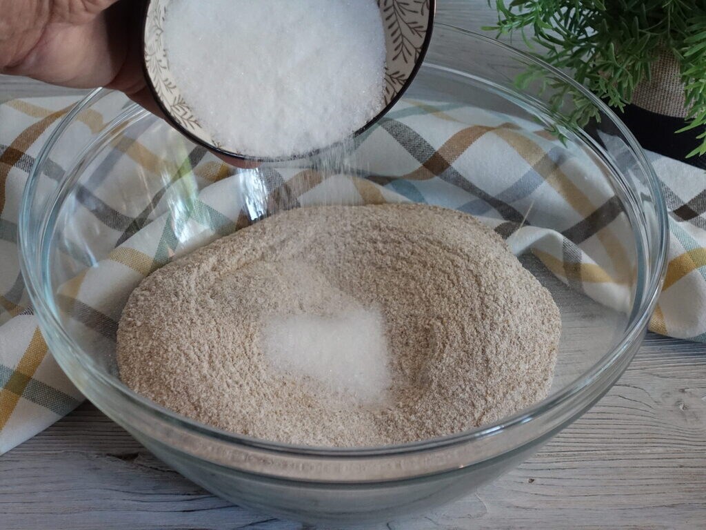 Ik heb het volkorenmeel in de kom gedaan, in het midden