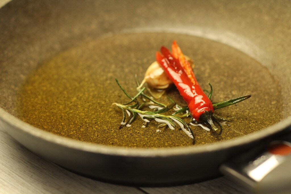 Bereid de met peper, rozemarijn en knoflook gearomatiseerde olie voor.