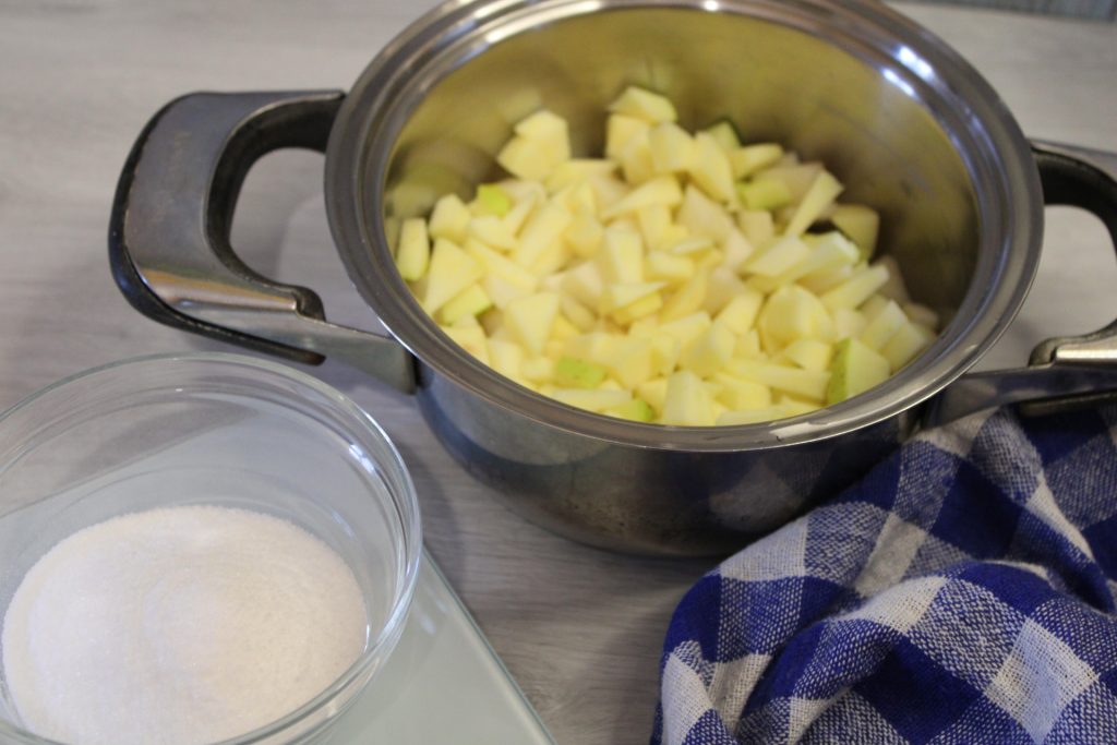 • De eerste stap na het schillen van de peren en ze in stukjes snijden is om ze te koken met 100 gram suiker en ze te koken tot bijna al het natuurlijke vocht is verdampt.
