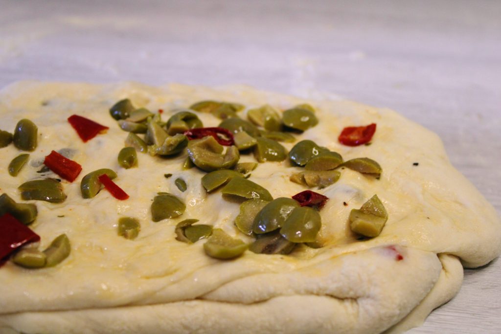 Er zijn niet veel stappen nodig, na het kneden laat je het rijzen en dan geef je het vorm na het toevoegen van de olijven.