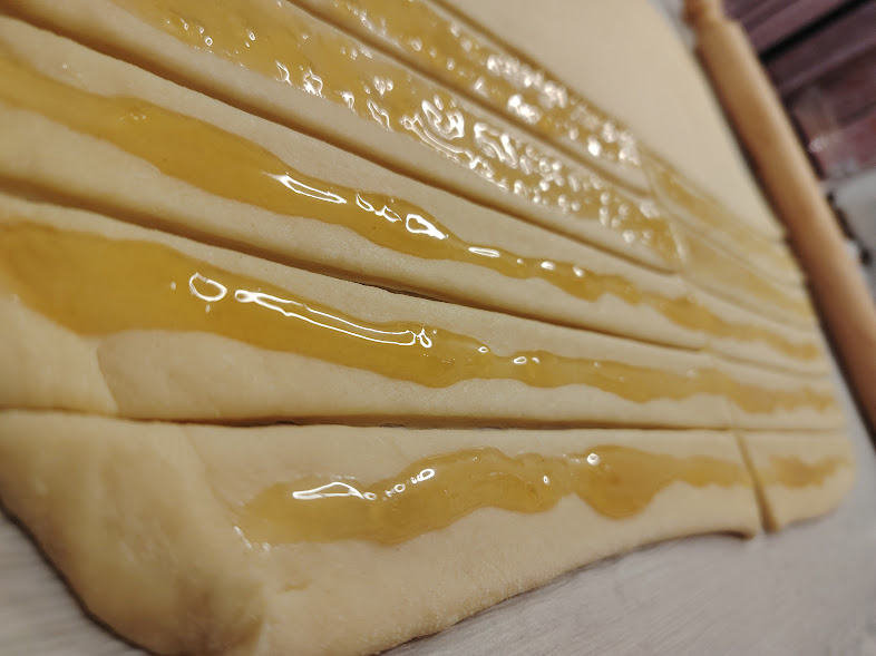 • Snijd repen van een cm breed en 30 cm lang. Experimenteer en pas aan naar eigen smaak, want ze zullen nog rijzen tot ze verdubbelen. Bestrijk met sinaasappelgelei of jam.