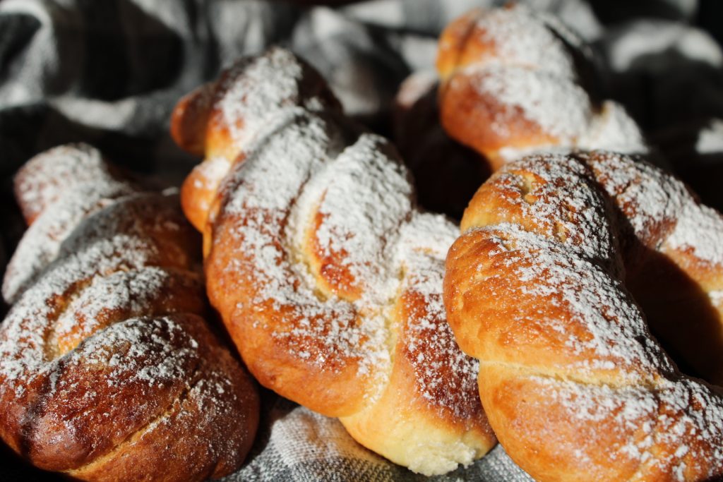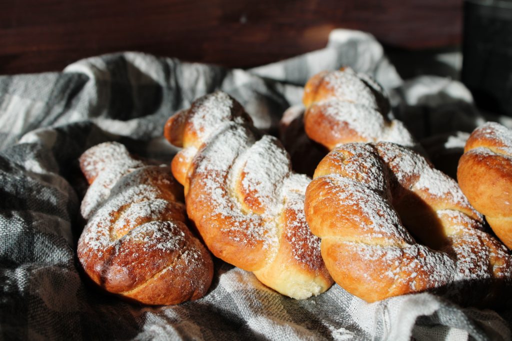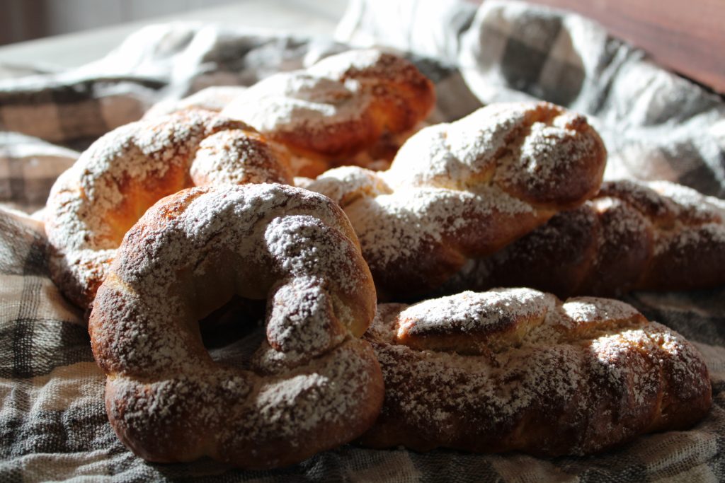 Snijd en vlecht de stukken tot vlechten en donuts. Laat opnieuw rijzen. Tijdens de laatste rijs denk ik aan de zalige jeugd en glimlach ik.