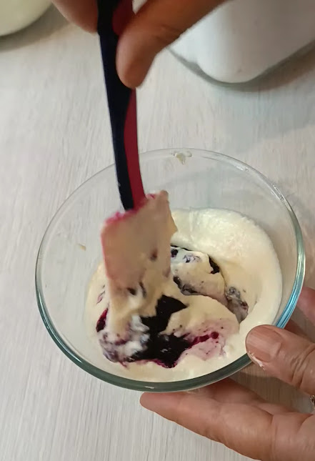 Als het eenmaal tot room is gereduceerd, voeg je de gezeefde ricotta toe, poedersuiker, waarbij je je aanpast aan je persoonlijke smaak, de opgeklopte room en voeg op 3/4 de inmiddels afgekoelde bosbessenjam toe, waarbij je een klein beetje apart houdt voor de decoratie