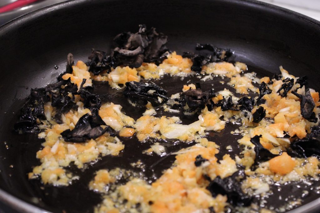 - 300 champignons (Vers of gedroogd, ik heb trompetten gebruikt, heerlijk zijn eekhoorntjesbrood of honingzwammen. Als gedroogd, laat ze weken in een beetje azijn en knijp ze uit, je kunt ook champignons in olie gebruiken, zodat ze al een percentage zuur bevatten.)