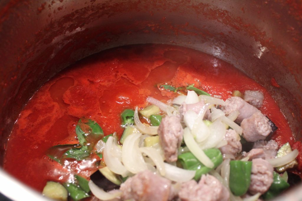 Bereid apart de tomatensaus met gepelde tomaten (ik heb de tomaten een minuut of twee, afhankelijk van de variëteit, geblancheerd in kokend water, daarna in koud water gedompeld na ze met een schuimspaan te hebben uitgelekt en door de passe-vite te halen) Voeg de gebakken groenten toe, breng op smaak met zout en voltooi het koken, dit duurt ongeveer 30 minuten.