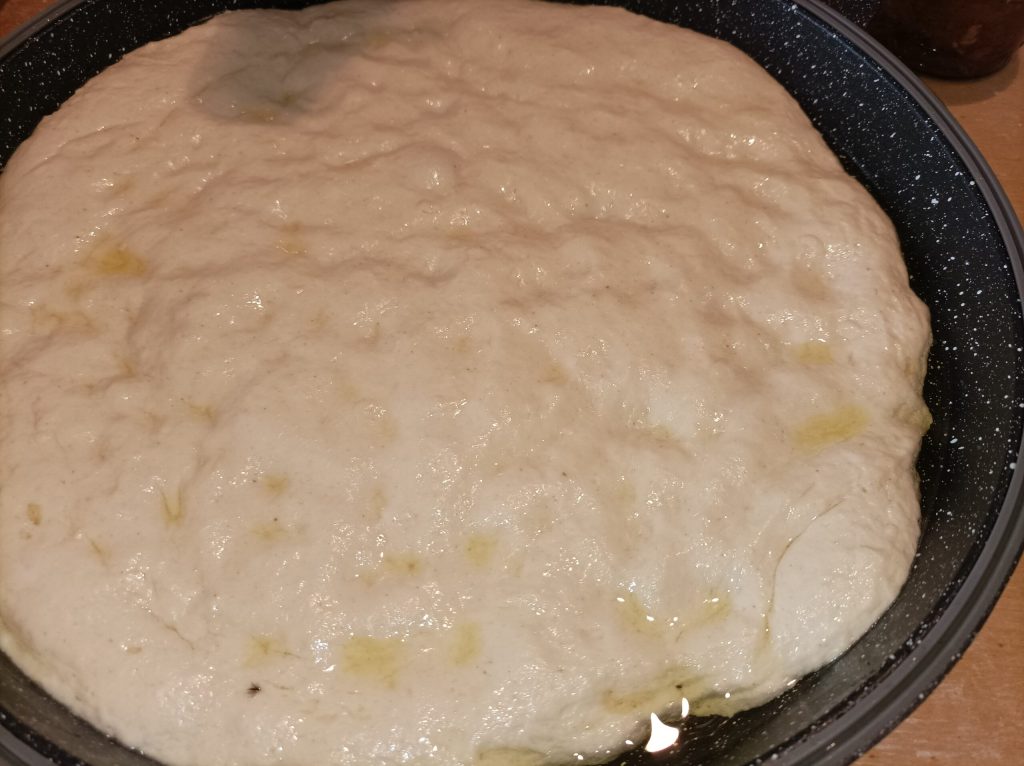 Vanmorgen heb ik het zuurdesem ververst en met het overschot heb ik de focaccia bereid om in de pan te bakken voor het avondeten. Bij warm weer gebruik ik de oven weinig. Ik probeer andere kookmethodes. De dubbele pan is een hulp voor mij.