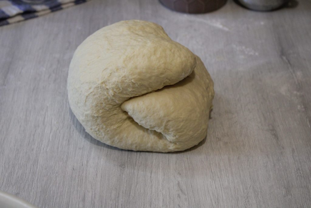 Draai het deeg om en herhaal de vouwen zonder het plat te drukken. Leg het in een kom en dek af om te laten rijzen tot het verdubbeld is. Ik gebruik de oven met een pannetje kokend water op de bodem; dat werkt uitstekend als rijsruimte.