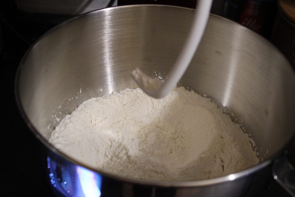 • Giet de bloem, suiker en zout in een kom of keukenmachine, meng en voeg de boter en olie toe.
