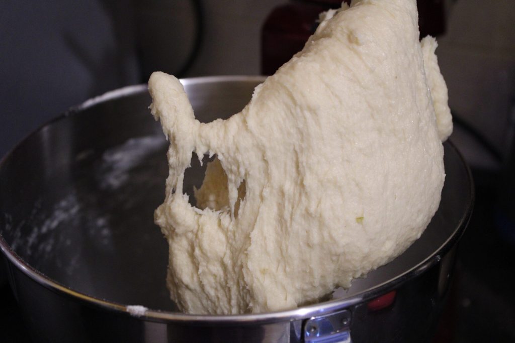 • Voeg toe aan de bloem en boter. Kneed lang totdat je een glad mengsel krijgt. Haal uit de kom en doe een drievoudige vouwronde. Laat rijzen tot verdubbeling na in een bakje met folie te hebben gedaan.