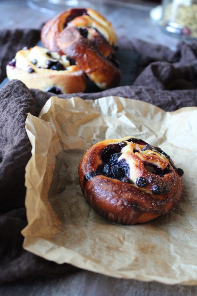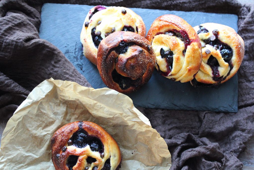 Gerezenbroodjes met bosbessen en chocolade. Tijd voor bosbessen, tijd voor gerezenbroodjes en vele andere recepten met deze heerlijke vrucht die ik direct op mijn planten kan vinden in mijn voortdurende experimenten. Ik leerde hun teelt kennen in de Po-vallei, werd er verliefd op en dacht toen: wat als ik in mijn tuin ook een paar bosbessenplanten kweek? Zo gezegd, zo gedaan! Ik koos zorgvuldig mijn planten, zette ze in grote potten met de juiste aarde en deed de eerste oogst. Dit jaar heb ik meer planten toegevoegd, in de toekomst zal ik weten of ik de juiste keuze heb gemaakt.