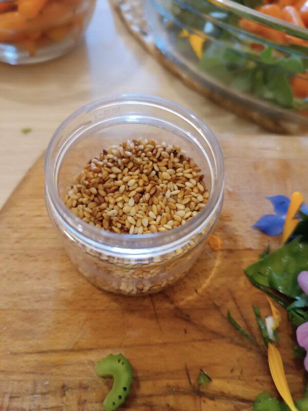 Voeg nu ook de geroosterde sesamzaadjes toe voor een nog bijzonderdere smaak
