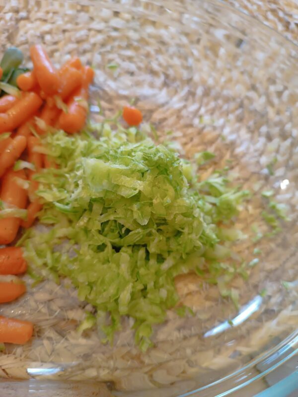 Maak de courgettes schoon, snijd ze in julienne of rasp ze met de grote mandoline, de mijne is erg mals en heerlijk. Voeg de wortelen, de bleekselderij in kleine stukjes en de postelein toe