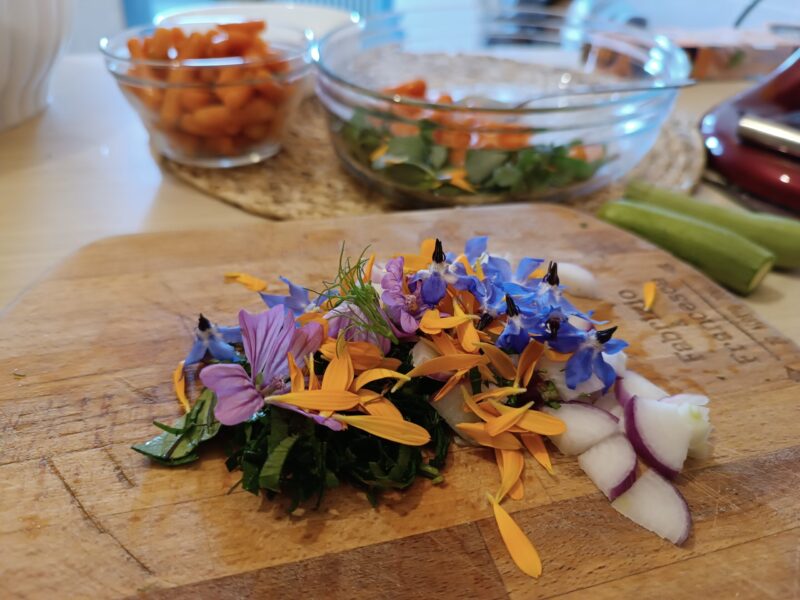 Roer op dit punt goed, breng op smaak met zout en olie en voeg de verse kruiden en bloemen toe.