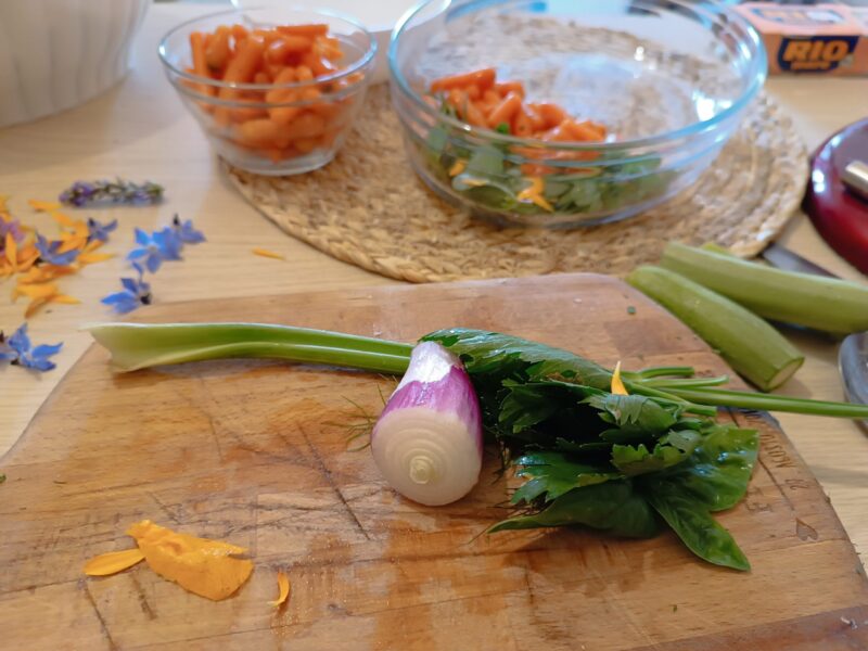 - 1 bosje verse kruiden (Basilicum, selderijbladeren, venkel, de zachte delen van wilde venkel, peterselie, ik heb ook verschillende bladeren van mijn wilde postelein toegevoegd)