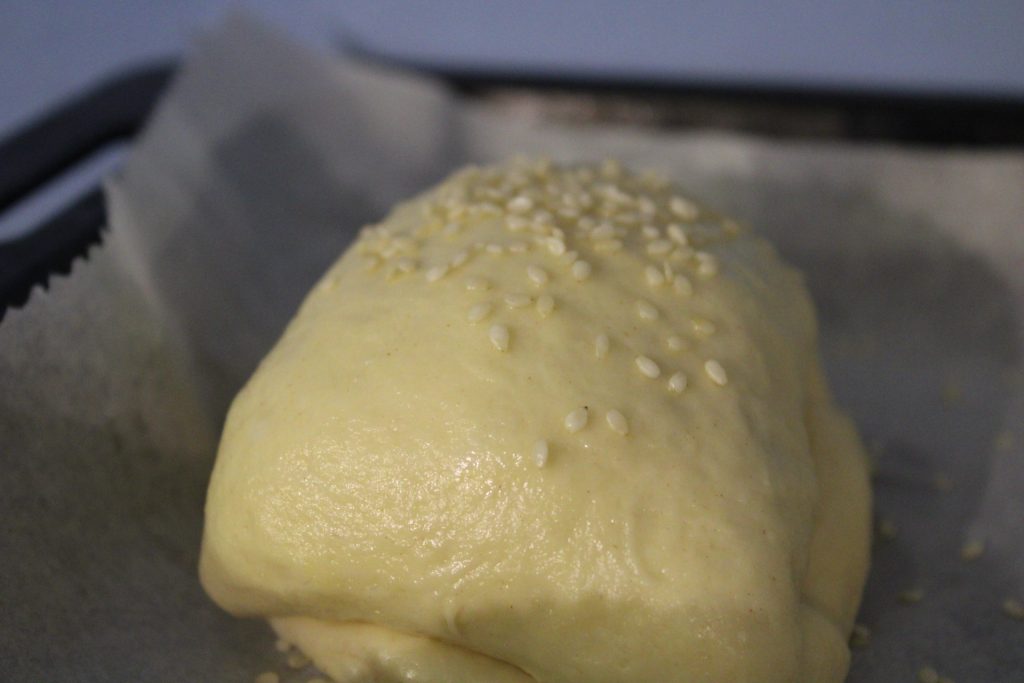 Sluit de broodjes goed af om te voorkomen dat de vulling eruit komt en bestrooi de bovenkant met sesam. Laat rijzen op een warme plek zonder tocht.