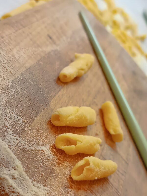 Typisch voor de regio Viterbo, meestal bereid met griesmeel en water; in deze versie heb ik ze met eieren gemaakt, mijn kippen leggen dagelijks eieren en ik moet ze op een of andere manier consumeren, thuis eten we weinig vlees, dus dat is prima…In dit recept zitten beide, normaal gesproken als een hoofdgerecht alle voedingsstoffen al bevat, maak ik geen tweede gerecht.