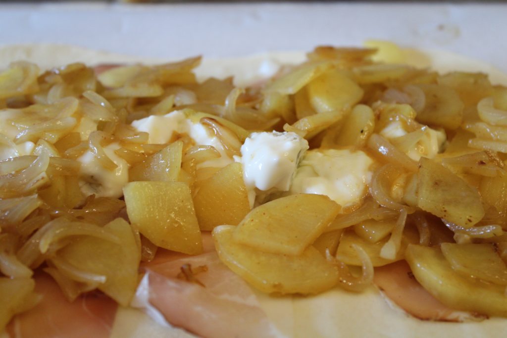 • Bak ondertussen de dun gesneden uien en in blokjes of plakjes gesneden aardappelen met de rozemarijn. Breng op smaak met zout en kook een paar minuten. Rol het deeg uit tot een erg dun rechthoekig vel, laat een beetje over voor de decoratie. Leg de plakjes spek neer, laat de zijkanten vrij, daarna de uien en aardappelen en tenslotte de gorgonzola. In dit recept, zoals in vele anderen, weeg ik de ingrediënten niet, de gewichten zijn indicatief, volg uw smaak.