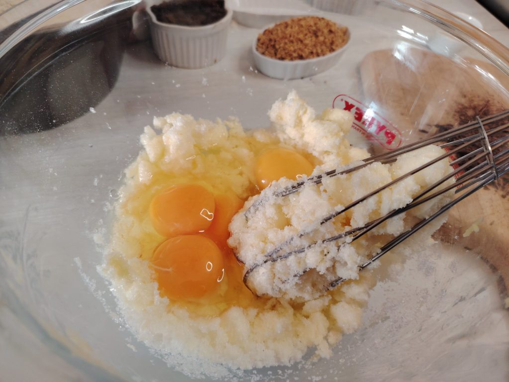 • Bewerk de zachte boter, de suiker en de eieren in een kom tot een crème.