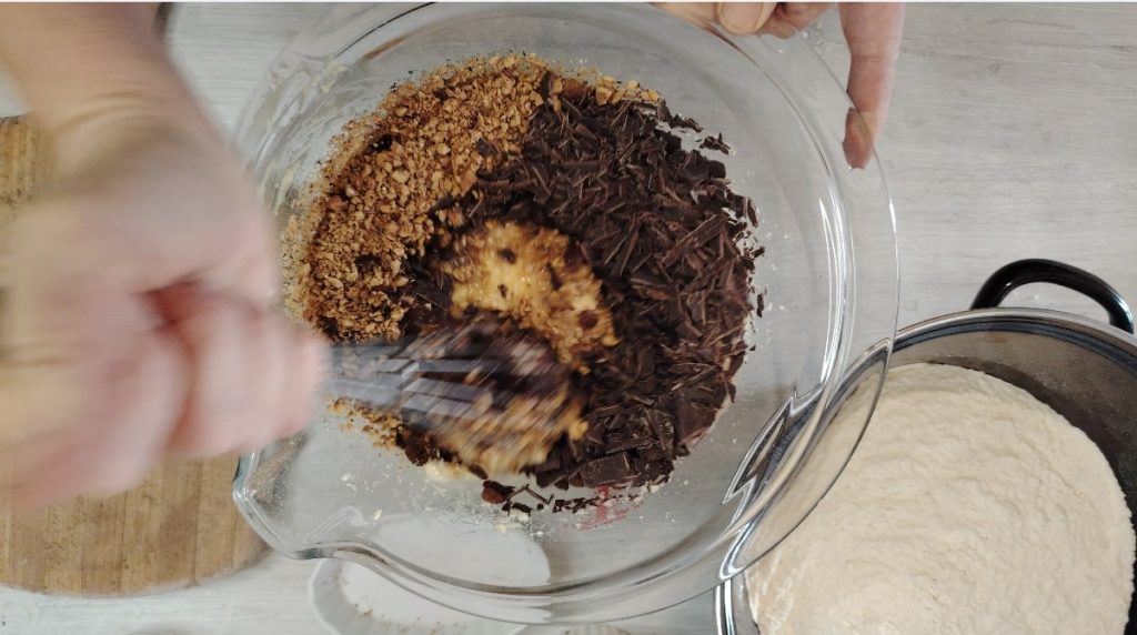• Voeg de hazelnoten, de rozijnen, de chocolade en de marsala toe; ten slotte de bloem gemengd met de ammoniak.