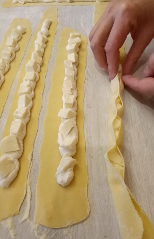 • Rol nu de eierpasta uit die je eerder hebt bereid; snijd in stroken van ongeveer 6 cm breed en plaats met behulp van een spuitzak de ricottacrème in het midden
