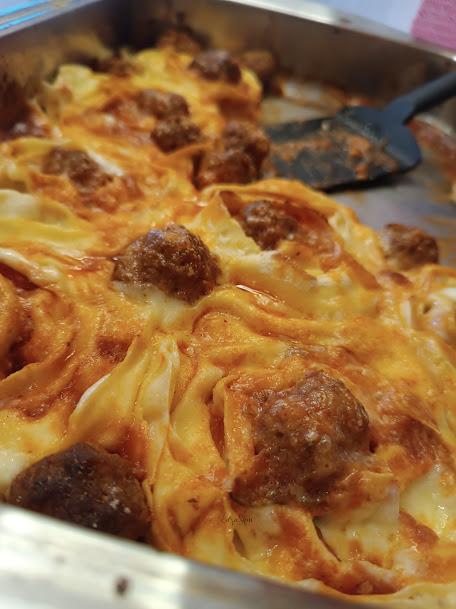 • En verdeel met enkele gehaktballen, strooi er kaas over en bak in een voorverwarmde oven