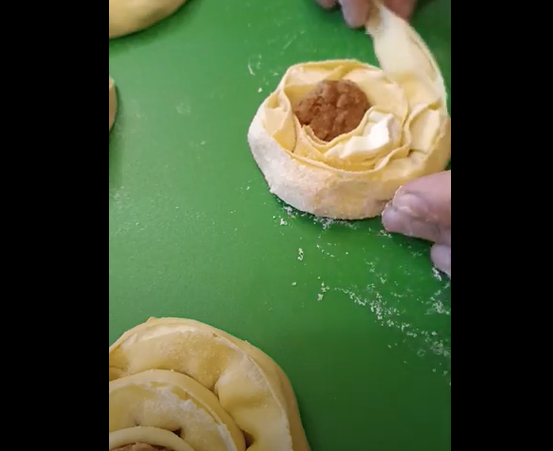 • Snijd de mozzarella in stukjes en verdeel het over de strook, die je daarna sluit door de randen samen te knijpen zoals op de foto