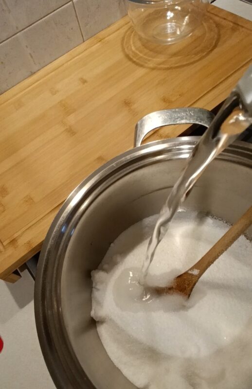 • In een stalen pan meng je de suiker met 150 gram water; de rest van het water (350 gram) giet je in een andere pan en verwarm je tot 65 graden