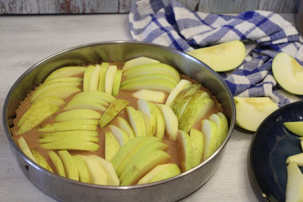 Giet het mengsel in de met bakpapier beklede vorm, of ingevet en met bloem bestoven. Snijd de appels in plakjes, ik heb de schil laten zitten omdat ik de herkomst ken, dus bepaal zelf wat je doet. Bak 35/40 minuten op 180 graden.
