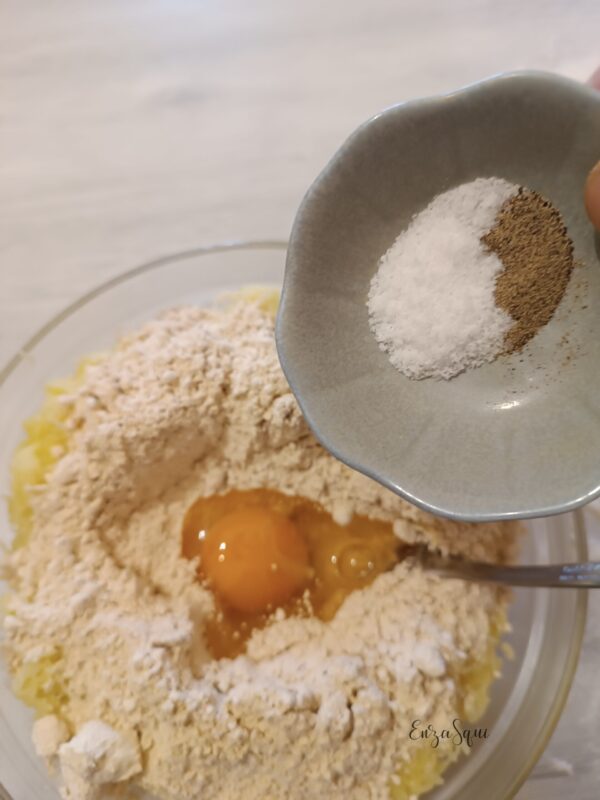 • Voeg ten slotte het zout en de zwarte peper toe, meng goed en leg het mengsel op het werkblad; kneed tot je