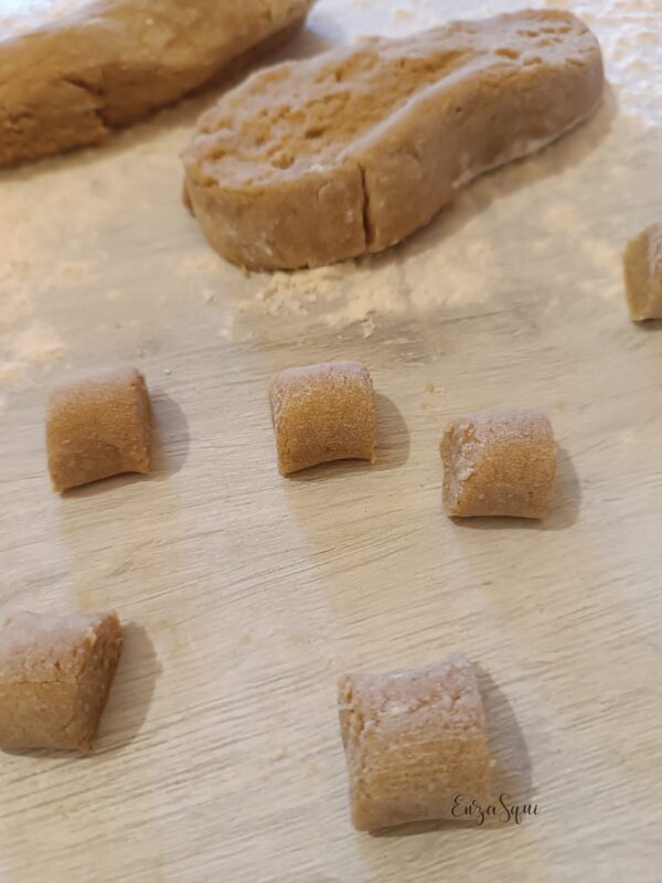 • Vorm eerst rolletjes van 2 cm in diameter die je in stukjes van 1,5 cm lang snijdt.