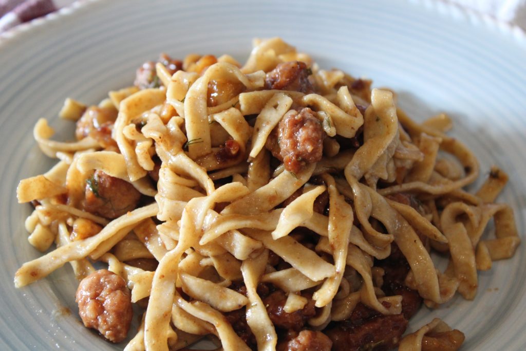 Kastanjetagliatelle met kastanjes met worst en venkel. Een uitstapje naar de bergen en de kastanjes om te consumeren komen eraan, dus zoekt men tussen de verspreide papieren naar recepten om te herhalen; zowel zoet als hartig. Nu presenteer ik een heel eenvoudig recept om te bereiden; ik geloof dat het kennen van snelle maar goede recepten, weer zin kan geven aan mensen om te koken die, wegens de vele uren buitenshuis, geen tijd hebben en dus kiezen voor kant-en-klare maaltijden. Daarom draag ik deze manier van koken ook op aan hen. Ten eerste omdat ik ook vele uren van huis ben en ik weet hoe het voelt om geen tijd en soms zelfs geen zin te hebben om te koken wanneer het huis ’s avonds overal onze aanwezigheid vraagt. En als er kinderen zijn, nog meer.