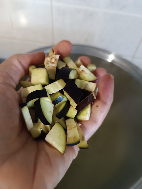 Snijd de aubergines in kleine stukjes en blancheer ze in gezouten water, laat ze goed uitlekken en…