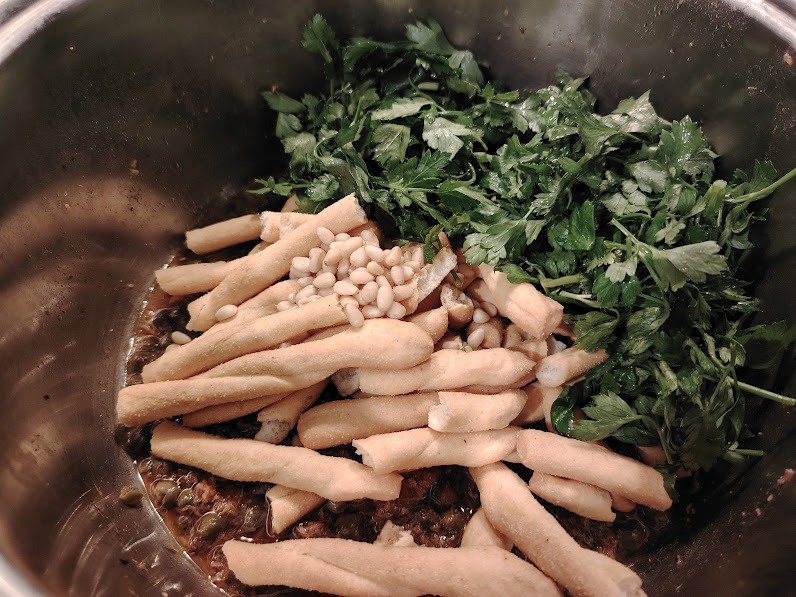 Voeg aan de kookbodem de grissini, de peterselie en de pijnboompitten, de azijn en olie toe naar behoefte. Mix en serveer de rolade met deze rustieke en smaakvolle groene saus.