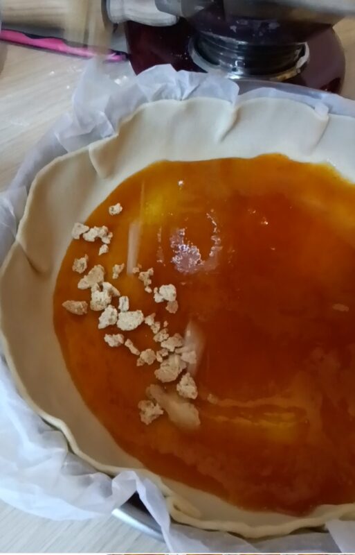 • Ondertussen bekleed je de vorm met bladerdeeg; het tweede vel bewaar je voor de decoratie. Giet de abrikozenjam erin en verdeel goed over de bodem