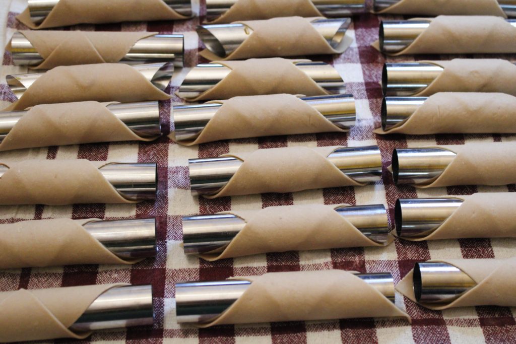 Na de rusttijd gebruik je een deegroller of een pastamachine om vellen te maken; snijd deze vervolgens in vierkantjes van ongeveer 7 x 7 cm en wikkel ze rond de rietjes. Bak de gevouwen vellen in goed hete olie tot ze een mooie donkere kleur hebben. Laat eventueel overtollig olie wegtrekken op keukenpapier.