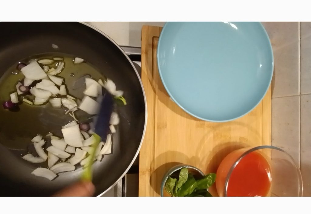 en voeg dan de tomaat en basilicum toe. Breng op smaak met zout en voltooi het koken