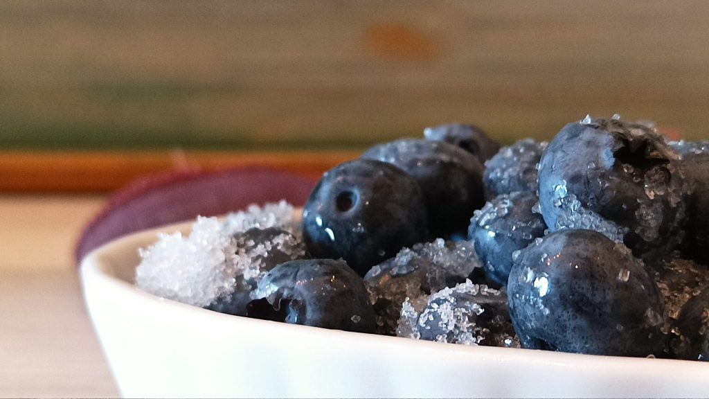 Voeg de suiker en bosbessen toe in een pan en kook op laag vuur tot de suiker is opgelost. Ongeveer tien minuten, houd ze zo veel mogelijk heel.