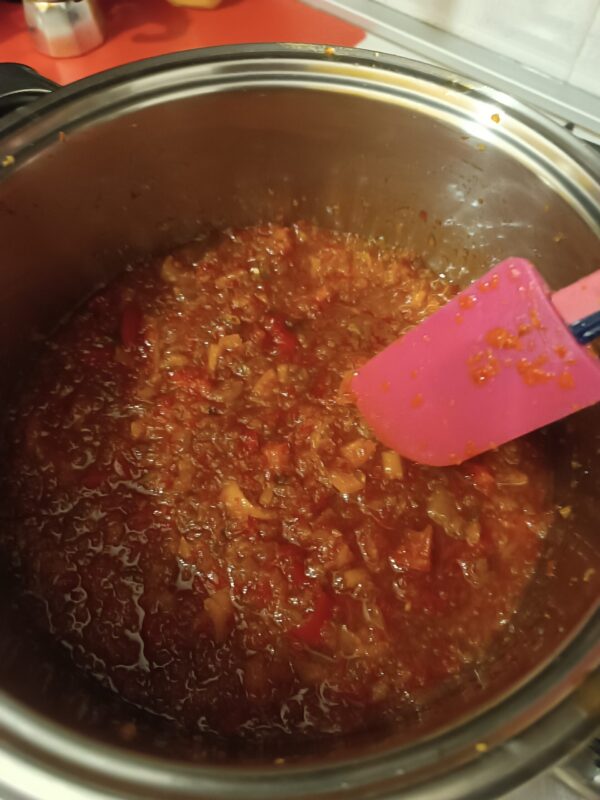 Als je klaar bent met snijden, voeg dan alles in de pan; paprika’s, water, suiker en roer; dek niet af en laat het op een rustige plaats staan tot de volgende dag. Deze stap dient om zoetheid op te nemen.