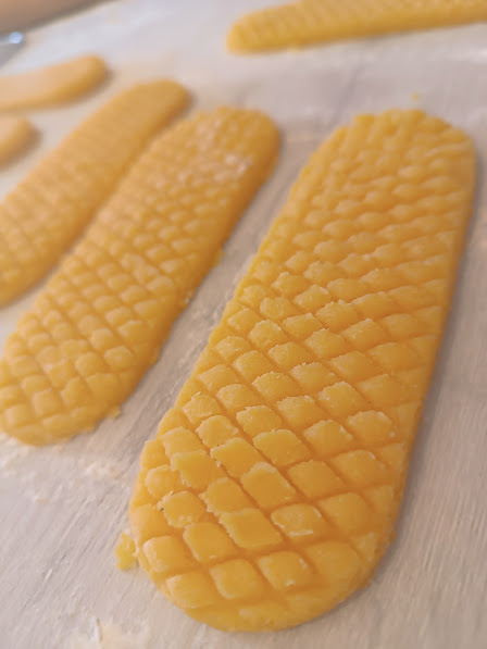 Giet het op het werkblad en werk het deeg af; Rol het niet te dun uit en snijd het in de gewenste vormen, ik koos ervoor om een maïskolf te maken