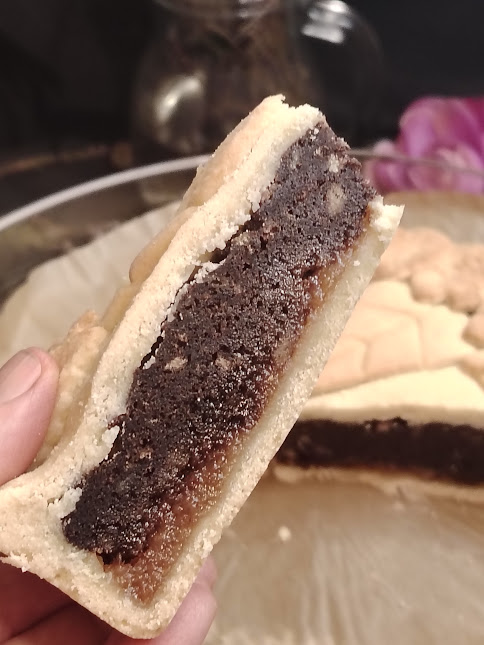 Zanddeeg, perencompote en romige chocolade; een aangepaste versie van de peren en chocoladetaart, die ik persoonlijk niet lekker vind. Ik bedacht deze versie, zowel omdat ik een overvloed aan peren had om te consumeren, als omdat ik het persoonlijk lekkerder vind. Een bijzondere taart met een zachte kern.